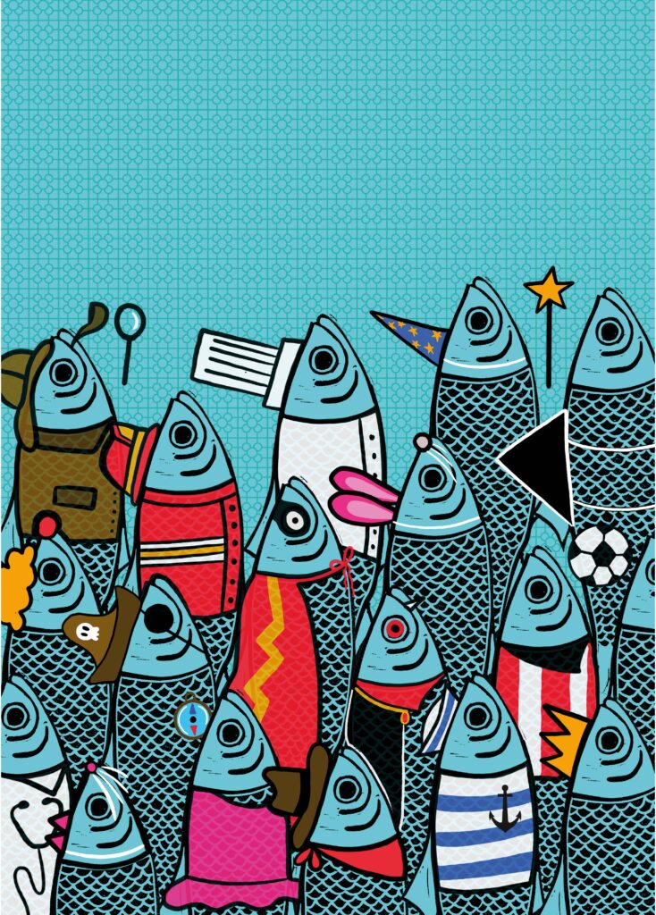 Antes de comenzar con el diseño, llevé a cabo un estudio sobre elementos representativos de Bilbao y cómo podía plasmar la idea de igualdad en la diversidad, un valor esencial del carnaval. Decidí que la sardina, símbolo de la tradición marinera, sería el elemento perfecto para representar este concepto de manera visual.